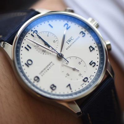 新品:葡萄牙系列计时码表新款白面蓝圈,搭配军用蓝面织布带,最适合秋天冬天佩戴。机芯稳定,双层镀膜,玻璃通透,厚度跟正品一致。