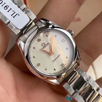 专柜爆款,独家首发!欧米茄海马系列Aqua Terra女士腕表环镶璀璨美钻,诠释精致迷人风范。这款精钢腕表采用对称设计28毫米表径,非常秀气、精美绝伦!配备闪烁微光的白面表盘,8枚圆点镀铑小时刻度和4枚钻石小时刻度贴镶于镀铑托槽之上。指针亦经过镀铑处理,表背于波纹背景之上浮雕欧米茄海马徽章图案。腕表搭配精钢表链,内部搭载欧米茄4061机芯。配全套包装,带GTC证书出货!