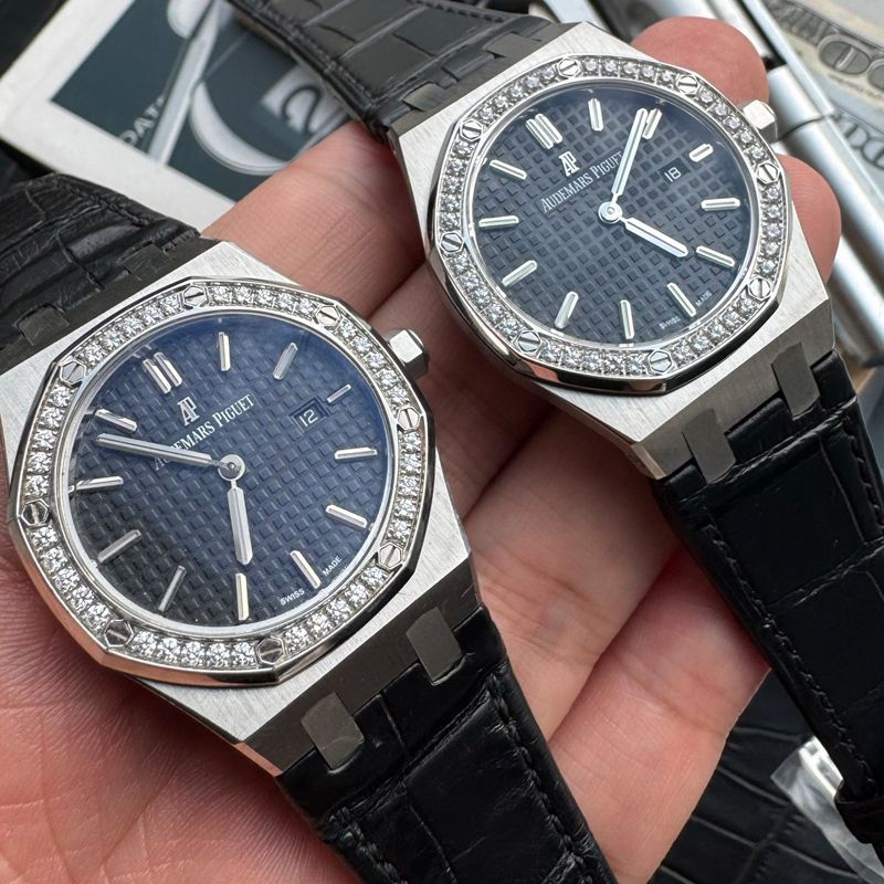 正品 vs V7 效果如图: V7厂爱彼皇家橡树系列 67651OR 女士石英腕表,卓越与经典的结合。一款象征奢华与工艺巅峰的经典手表。这款手表不仅仅是计时工具,更是一件艺术品。 纹理独特:表盘上镌刻有“grandetapisserie”大格纹装饰,这种格纹纹理细腻、规整且富有立体感,犹如精心编织的织物一般,为表盘增添了独特的视觉效果和艺术气息。 表径为33MM,这个尺寸对于女士腕表来说较为适中,既不会显得过于小巧而缺乏存在感,也不会因为过大而影响佩戴的舒适性和美观度,能够很好地贴合女性的手腕。 表壳厚度为7毫米,整体较为纤薄,使腕表佩戴起来更加轻盈,不会给手腕带来过多的负担。 皇家橡树67651延续了标志性的八角形表壳,展现了爱彼独特的工艺美学。每一处细节都经过精心雕琢,体现了品牌对完美的追求。 指针经典:采用皇家橡树指针,这种指针形状独特,宽大且线条流畅,具有较高的辨识度,与表盘的整体风格相得益彰,为腕表增添了一份优雅与大气。 搭配的皇家橡树指针同样具有夜光功能。指针的夜光涂层能够确保在光线不足的情况下,指针的轮廓和指向依然清晰可见,与夜光时标相互配合,进一步提高了时间的可读性。 表带的各个链节之间衔接紧密且自然。在打磨过程中,工匠对链节的连接部位进行了精细的处理,使得链节之间的过渡非常顺畅,没有明显的缝隙或高低差,整个表带宛如一个整体,佩戴起来舒适且美观。有钢带与美洲鳄鱼皮表带可供选择,均为原版开模。 67651为密闭表底,表底上镌刻皇家橡树系列的英文名称“Royal Oak”字样。搭载瑞士原装石英机芯784,精心打磨加工夹板工艺,更加接近原版设计。 V7厂爱彼皇家橡树系列不惜成本镶嵌世界最顶级的120切面施华洛顶级锆石,每一颗都攥刻有swarovski zirconia(用放大镜可看到,行业唯一一家),Swarovski zirconia是全球首款合成立方氧化锆,完全符合首屈一指的国际钻石评级权威GIA在评定钻石切割等级的综合标准,凭借无可比拟的璀璨光芒,可媲美钻石!整体效果已无限接近正品!可谓用心良苦,超高性价比带来的正品即视感为之点赞‼️ SWAROVSKI ZIRCONIA是全球首款合成立方氧化锆完全符合首屈一指的国际钻石评级权威,美国宝石协会(Gemological Institute of America,简称GIA)在评定钻石切割等级的综合标准。凭借无可比拟的璀璨光芒,SWAROVSKI ZIRCONIA已成为市场上最优质及最能与钻石媲美的合成立方氧化锆。完美饱和的色彩,精湛非凡的切工,源自施华洛世奇逾百年的精确切割经验,以及幻彩钻石的灵感启发。此外,已获专利的表面优化工序TCF (热熔着色技术),为SWAROVSKI ZIRCONIA缔造出鲜艳夺目的色彩;这项技术不但符合环保要求,更确保每颗宝石没有经过辐照处理,不含辐射。由此而来的合成立方氧化锆色彩持久之余,亦经得起日常使用的考验。 品质保证 V7厂每颗SWAROVSKI ZIRCONIA均刻有非肉眼可见的认证标记。以镭射镌刻的“SWAROVSKI ZIRCONIA”品质认证标志